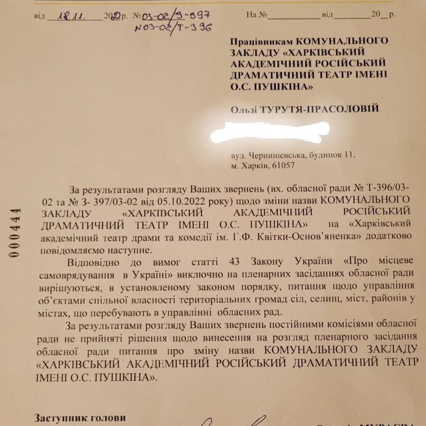 "Колектив вкотре звертається до вас з проханням про перейменування на Харківський академічний драматичний театр", — зазначено в листі від 30 листопада за підписом в. о. директорки театру Ольги Ткаченко.