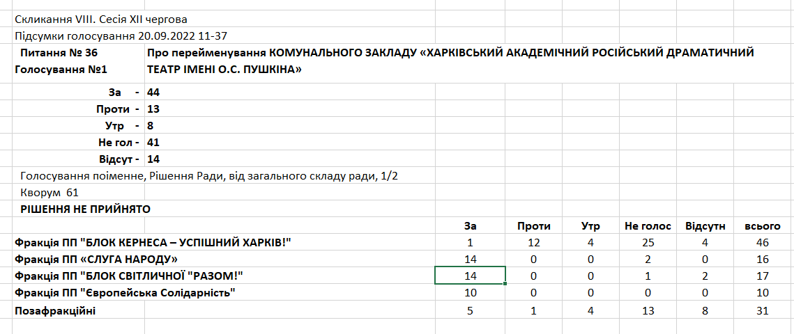 Вирішальною стала позиція найбільшої фракції ‒ "Блоку Кернеса ‒ Успішний Харків", що складається з 46 депутатів: вона дала лише один голос "за". 12 членів цієї фракції проголосували проти перейменування. Решта ‒ утрималися, або не голосували, засвідчивши тим самим свою позицію щодо небажання перейменування театру. Аналогічно вчинила більшість позафракційних депутатів ‒ колишніх членів ліквідованої фракції проросійської партії "Опозиційна платформа ‒ За життя", діяльність якої в Україні наразі заборонена.